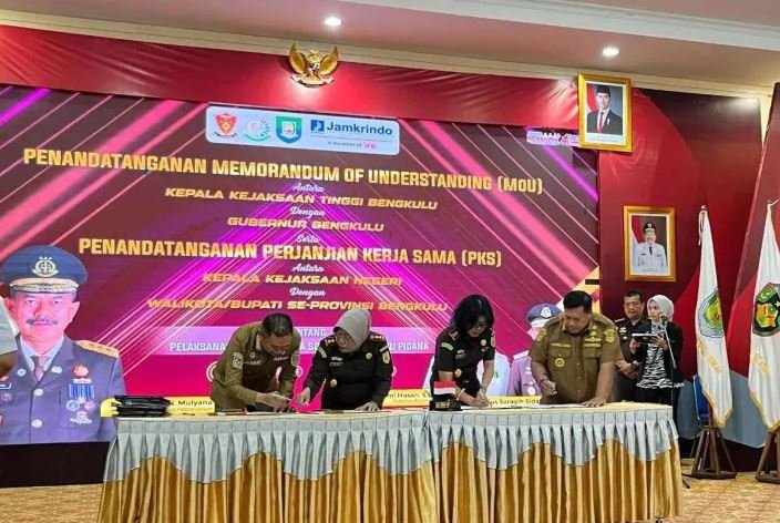 RJ News.id – Sebuah langkah besar menuju wajah penegakan hukum yang lebih manusiawi dan berkeadilan kembali ditegaskan di Provinsi Bengkulu. Bupati Mukomuko, H. Choirul Huda, SH, didampingi Kepala Kejaksaan Negeri Mukomuko, Yustina Engelin Kalangit, SH, M.Hum, menghadiri langsung penandatanganan Memorandum of Understanding (MoU) antara Kepala Kejaksaan Tinggi Bengkulu dan Gubernur Bengkulu, serta Penandatanganan Kerja Sama (PKS) antara Kepala Kejaksaan Negeri dengan wali kota dan bupati se-Provinsi Bengkulu, Selasa, 25 November 2025.