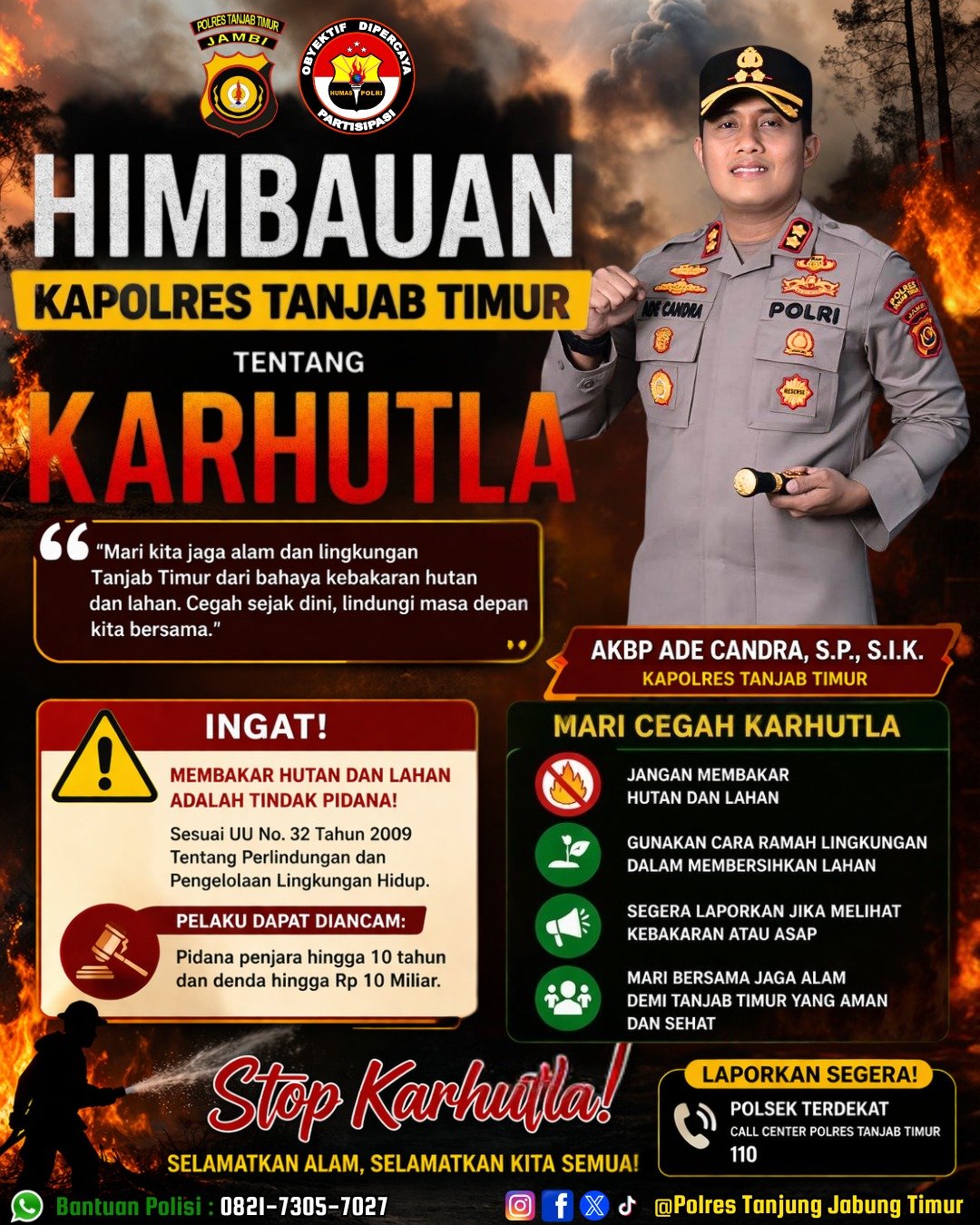 Tanjung Jabung Timur, RJNews.id – Dalam rangka upaya pencegahan terjadinya kebakaran hutan dan lahan (karhutla) khususnya di wilayah hukum Polres Tanjab Timur jelang hadapi Fenomena El Nino Tahun 2026, Kapolres Tanjab Timur Akbp Ade Candra, S.P., S.I.K., melalui Kasi Humas Polres Tanjab Timur Akp Edi Tasrif, S.E., menjelaskan bahwa pihaknya telah menyampaikan kepada Kapolsek jajaran Polres Tanjab Timur untuk melakukan himbauan baik secara lisan maupun pemasangan maklumat Kapolda Jambi dan spanduk tentang larangan aktivitas pembakaran pada saat membuka lahan hutan ataupun lahan perkebunan, Selasa (7/4/2026).