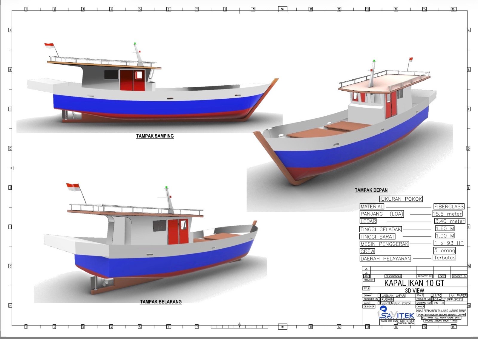Terkait kapal nelayan Tanjab Timur yang dikerjakan perusahaannya, ditegaskan Bambang tidak ada sama sekali perbedaan dengan dokumen perencanaan dan sesuai dengan hasil survei di lapangan tempat calon penerima bantuan kapal sebelum dikerjakan. Hanya saja, tambahnya, ruang tertutup pada kapal kayu nelayan yang dijadikan acuan dalam survei,lebih sedikit.