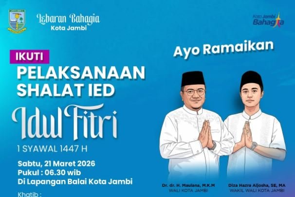 RJ News.id – Pemerintah Kota Jambi mengajak seluruh masyarakat untuk melaksanakan Salat Idul Fitri 1 Syawal 1447 Hijriah secara berjamaah di Lapangan Balai Kota Jambi, Sabtu 21 Maret 2026, yang akan dimulai pada pukul 06.30 WIB.